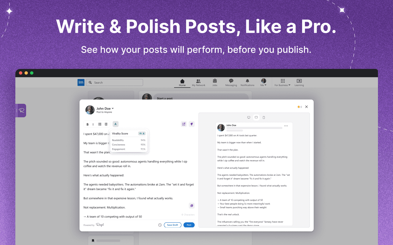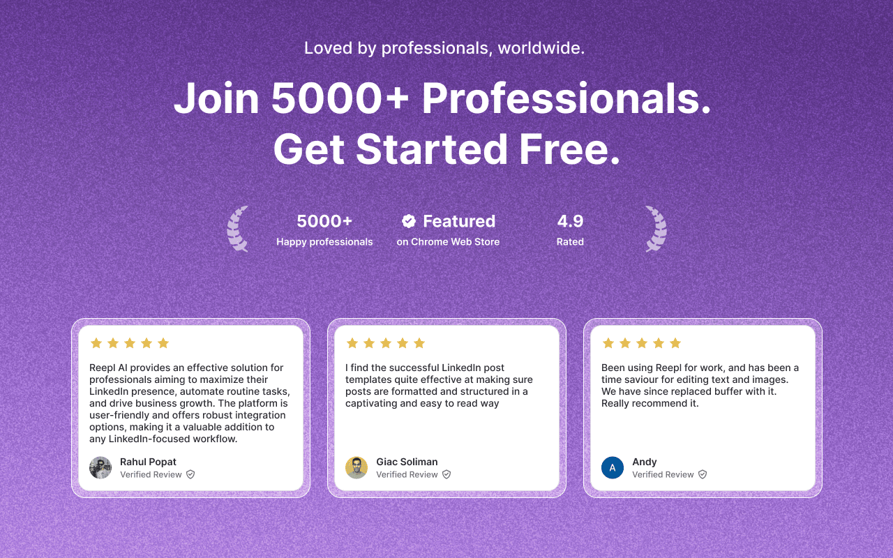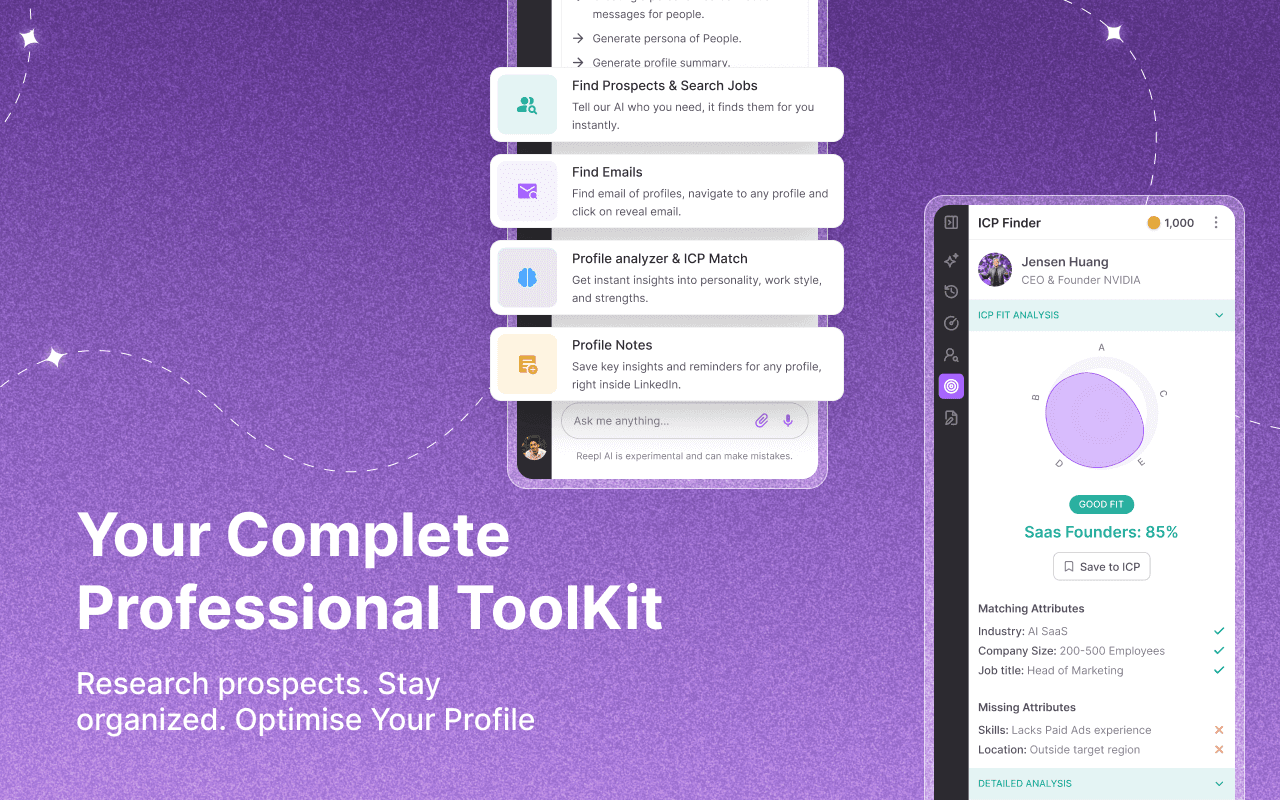 Reepl is your AI-powered LinkedIn co-pilot that helps you write better posts, grow your brand, and convert connections into clients — without spending hours every day. It brings all your growth tools into one streamlined workspace: an AI post writer that adapts to your tone, a viral-idea generator, a powerful carousel creator, a smart comment and reply assistant, real-time prospecting tools, light CRM for tracking leads, deep profile insights, on-page personalization through the Chrome extension, and analytics to monitor your performance.