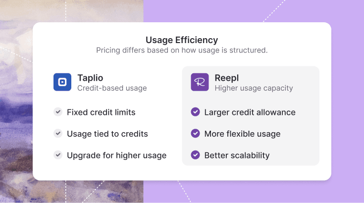 Taplio:Starter: $39/month — scheduling only, zero AI creditsStandard: $69/month — 250 AI credits, carousel creatorPro: $199/month — unlimited AI credits, lead databaseReepl:Starter: $39/month — scheduling only, zero AI creditsStandard: $69/month — 250 AI credits, carousel creatorPro: $199/month — unlimited AI credits, lead databaseFree plan forever, no credit card. BYOK available on all paid plans for unlimited generation.Here's the comparison that matters most for active users: if you write 3 posts per week and comment on 5 posts per day, you're generating roughly 12 posts and 150 comment drafts per month. At Taplio Standard, that's your 250 credits gone in under two weeks. At Reepl Pro, you'd use roughly 600–750 credits and have more than 4,000 left over.The platforms are also solving for different price points entirely. Taplio is designed for teams and agencies where $69–199/month is a line item. Reepl is designed for individuals and growing teams who want the same capability without the enterprise price tag.
