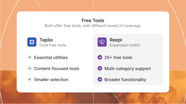 Both platforms offer free tools you can use without creating an account. Taplio's 11 tools cover the basics: engagement rate calculator, headline generator, post generator, summary generator, carousel builder, post booster, profile feedback, text formatter, video downloader, viral post generator, and top trends.Reepl has 25+ free tools. Beyond what Taplio offers (carousel generator, profile analyzer, headline generator, post formatter, time optimizer, virality checker), Reepl includes tools Taplio doesn't: a profile roaster, recommendation generator, connection request writer, LinkedIn poll creator, banner generator, video ad copy generator, video caption generator, video script generator, content calendar creator, tweet screenshot converter, ROI calculator, boolean search builders for job search and Sales Navigator, and video downloaders for LinkedIn, Twitter, and BlueSky.Every tool is accessible without creating an account or entering a credit card. Each one is also an entry point into the full Reepl platform -- if you like what a single free tool does, the Chrome extension and paid plans take it further.