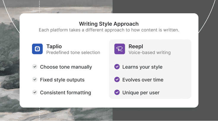 Taplio generates LinkedIn posts using AI. You enter a topic, select a format from 50+ templates, and choose a tone - casual, professional, assertive. The output is fast, and it follows patterns proven to perform on LinkedIn. The problem reviewers consistently flag: it sounds like Taplio, not like you. Multiple Reddit threads and Trustpilot reviews describe the output as "robotic," "template-based," and requiring "a ton of editing just to sound human." As Taplio's user base grows, its templates become more recognizable and more overused across LinkedIn feeds.Reepl takes a different approach. When you sign up, Reepl analyzes your existing LinkedIn posts and builds a Voice Profile from how you actually write - your sentence length, your vocabulary, your rhythm. As you use the product, Reepl tracks the edits you make to AI drafts, refining the model over time. After a few weeks, the AI produces content that sounds specifically like you - not like a tone slider set to "professional." You can also train the AI directly on writing samples, and choose from the latest models: GPT-4o, Claude Opus, Claude Sonnet, and Gemini 2.5. Taplio offers no way to change models.For writers managing multiple clients, Reepl maintains separate Voice Profiles per account. Each client's AI output sounds like that client.. not like the same tool applied to different topics.If you want posts that follow proven viral patterns, Taplio's 4–5 million post inspiration library is genuinely useful for research. If you want posts that sound like you wrote them, Reepl's voice learning is the better fit.
