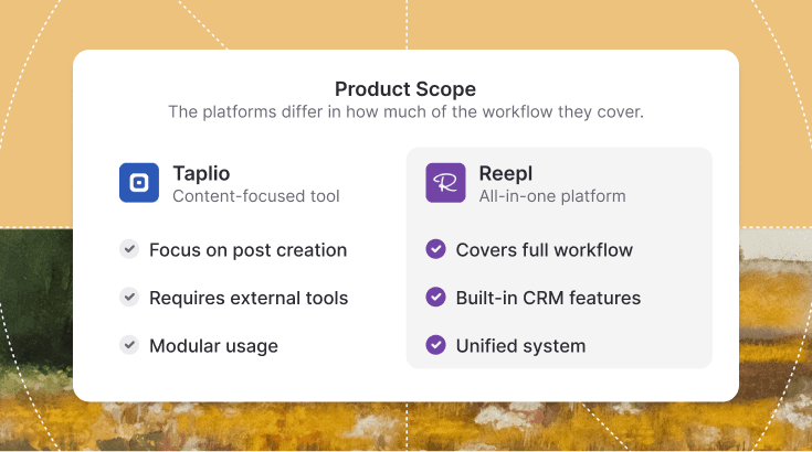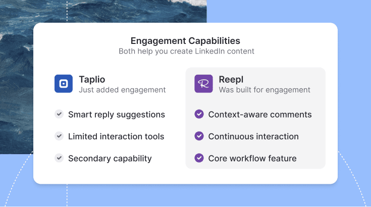 Both platforms let you write posts with AI, schedule content, and engage with your network. Both have Chrome extensions, carousels, and profile tools.But that's about where the similarities end.Taplio is primarily a content scheduling platform built around a viral post library. It added AI features — and engagement tools — later.Reepl was built around a different idea: AI should learn how you write, not replace how you write. Everything — comments, posts, DMs, scheduling, prospecting, CRM — was designed around that principle from day one.Let's look at what each platform actually does across the areas that matter.