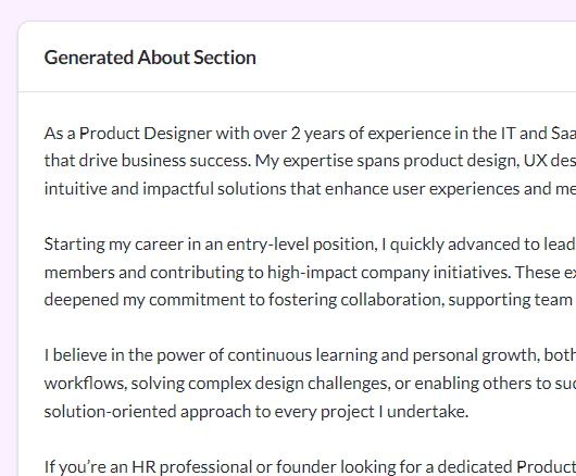 Click "Generate About Section" and get multiple AI-powered versions instantly. Edit, refine, and copy your favorite version directly to LinkedIn. It's that simple!