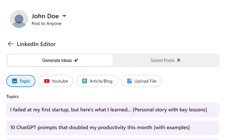 Drop in your thoughts, topic, or concept into the editor. Our AI can help transform your rough idea into a well-structured LinkedIn post outline.