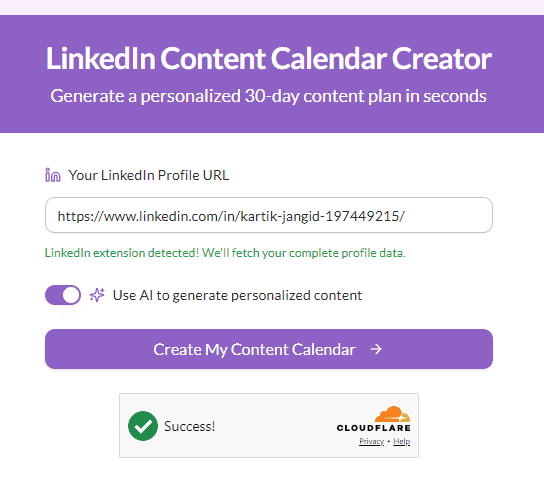 Your profile URL helps our AI understand your industry, job role, skills, achievements, and content style. This ensures the calendar includes topics you can authentically speak about, rather than generic content ideas. The more aligned the content is with your expertise, the better your engagement will be.
