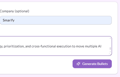 Hit Generate Bullets and watch your messy notes turn into clean, professional descriptions. Each bullet is written to highlight impact and results, not just tasks. Copy them to your LinkedIn profile and move on.