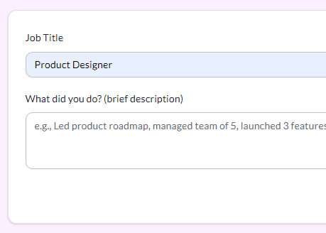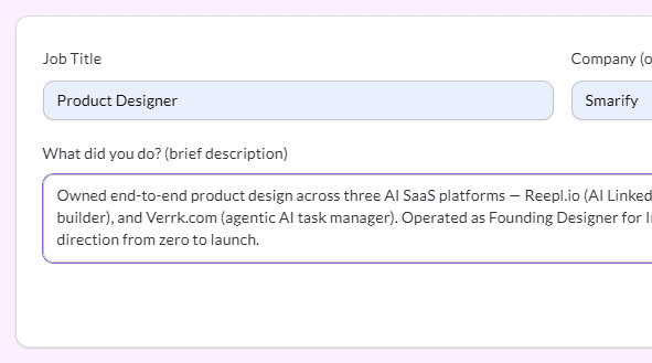 Most people describe their jobs with boring responsibilities that blend into every other profile. This tool turns what you actually did into sharp, results-focused bullet points that make recruiters and clients pay attention.