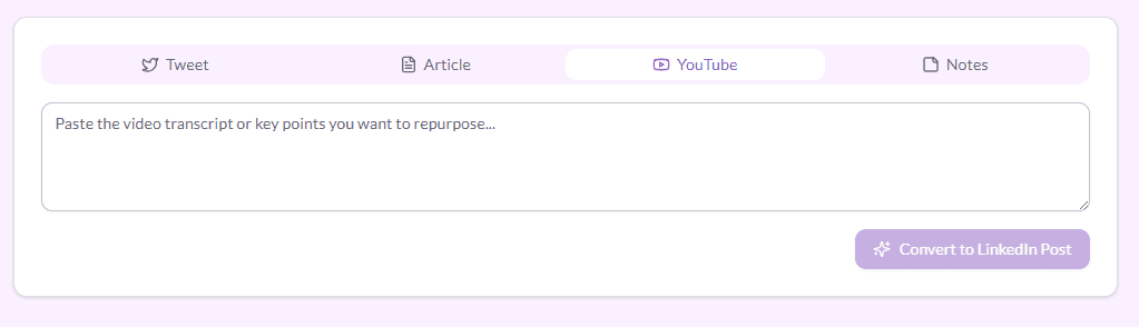 You already have great content sitting in tweets, articles, videos, and notes. Why start from scratch? This tool takes what you've already created and turns it into LinkedIn posts that fit the platform.