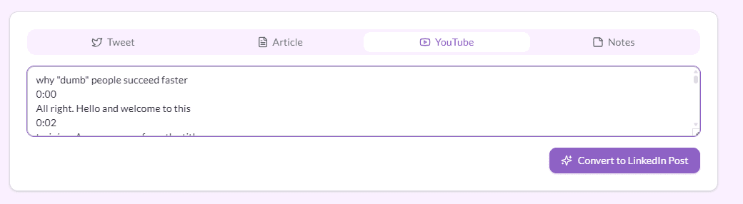 This tool handles tweets (via URL or text), articles, YouTube videos, and plain notes. If you have content in any of these formats, you can turn it into a LinkedIn post in seconds.