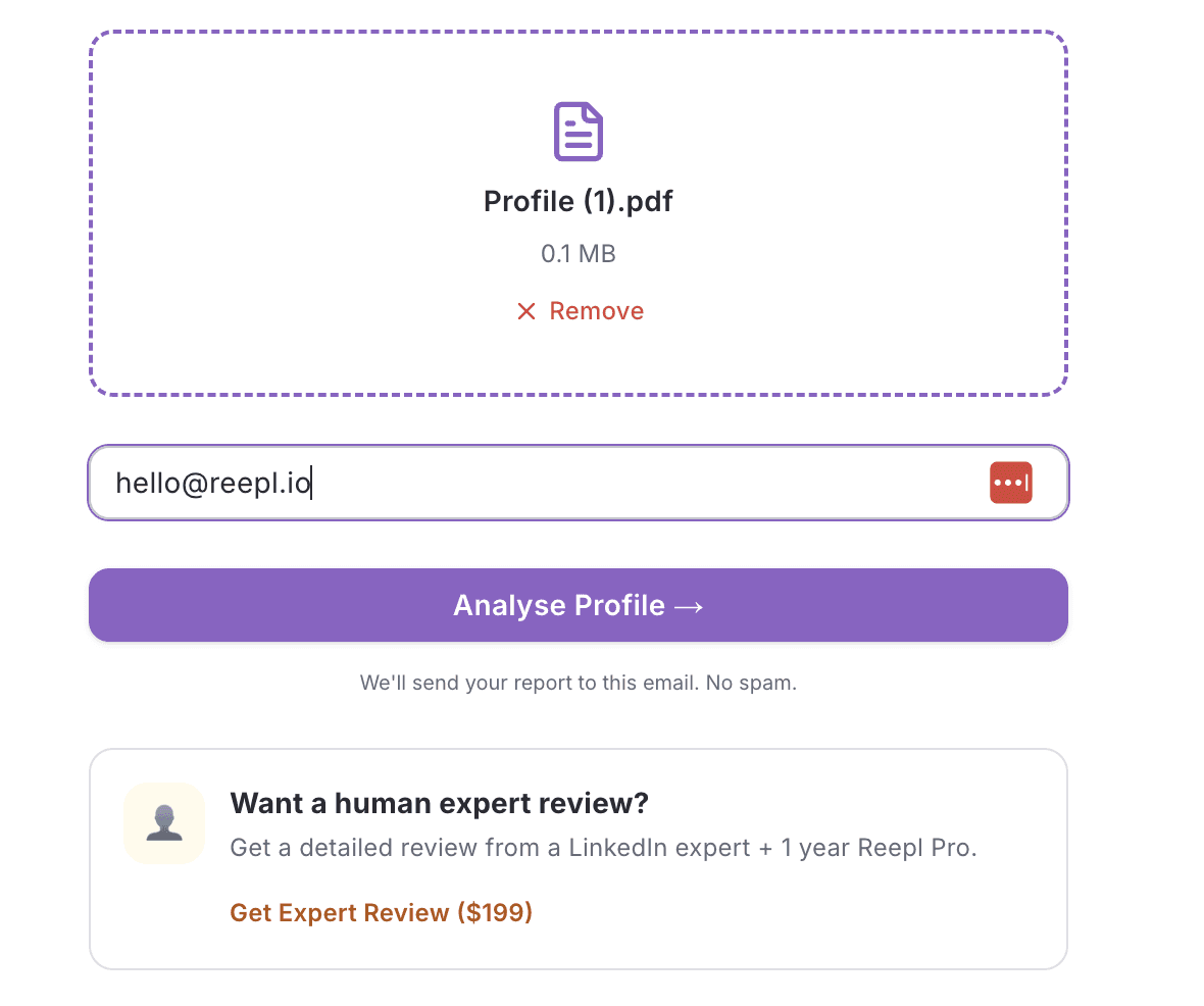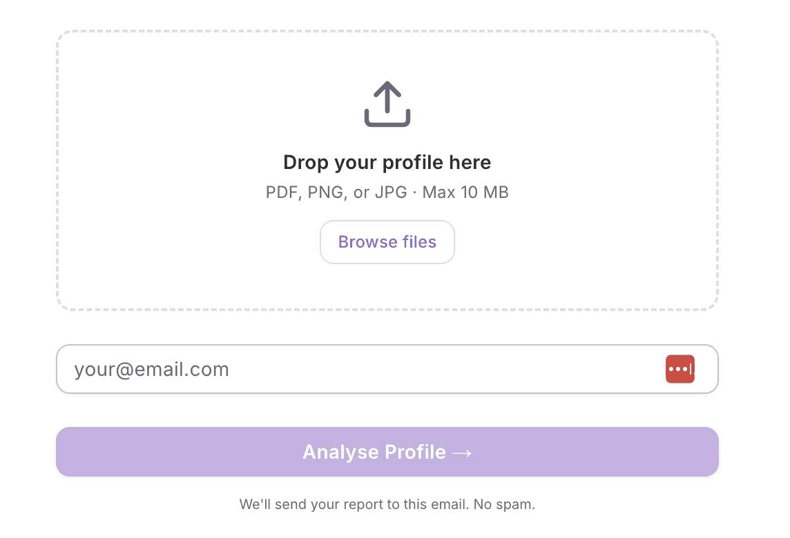 Export your LinkedIn® profile as a PDF, upload it, and get a score, category breakdown, and specific fixes - free to use.