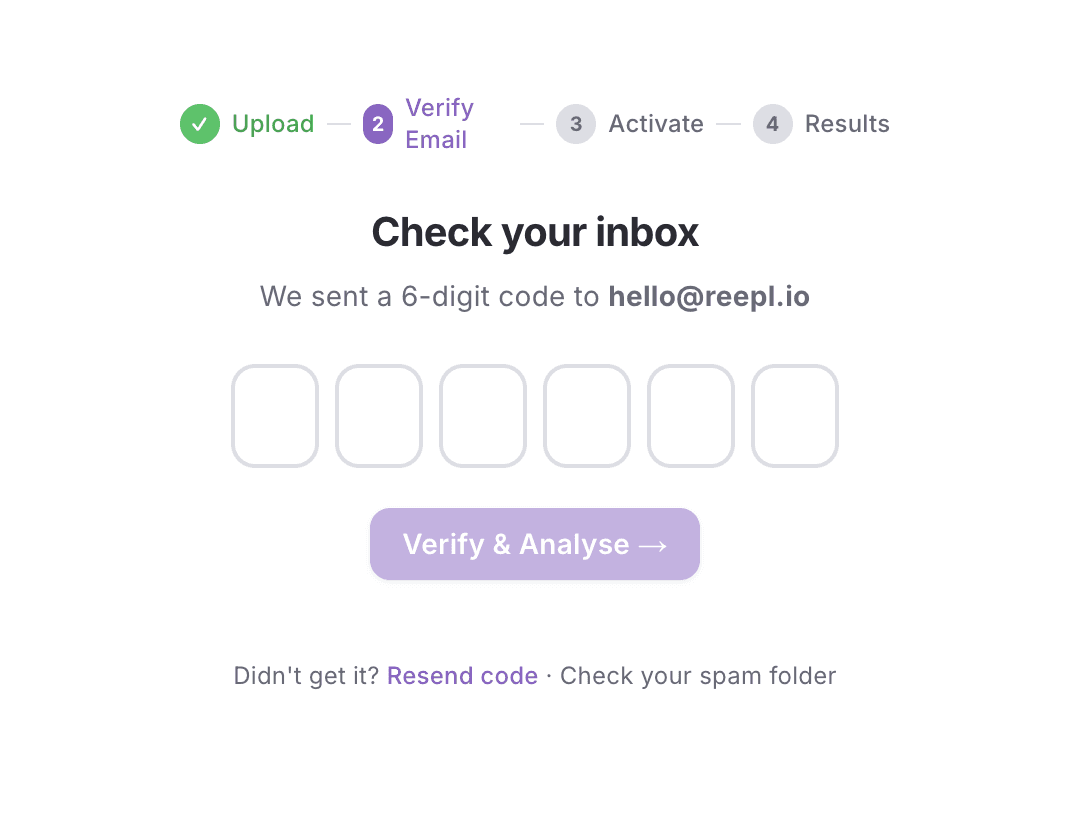 Create a free Reepl account or use your own OpenAI API key. The analysis runs immediately — results appear on screen and land in your inbox.