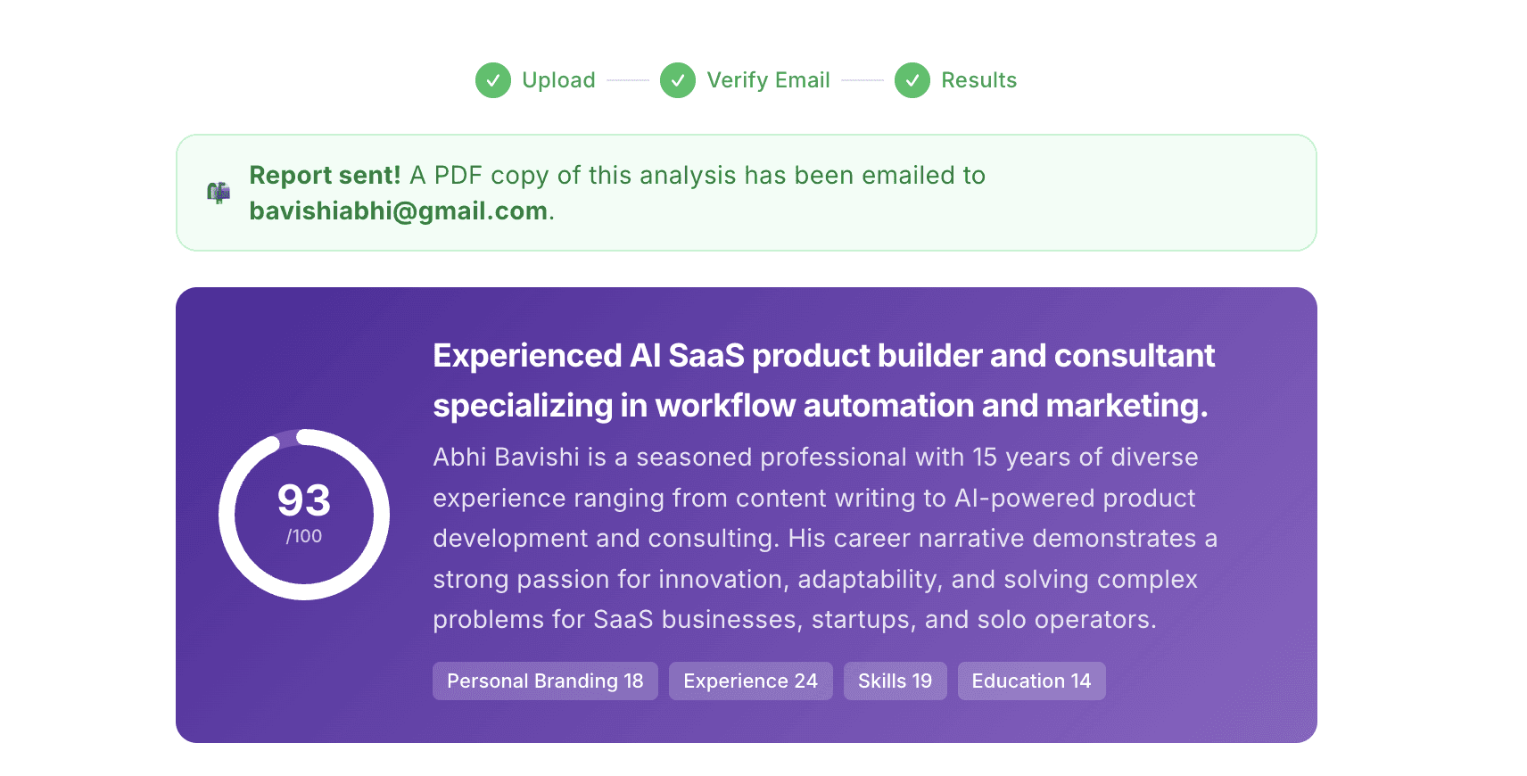 Upload your LinkedIn® profile as a PDF or screenshot and get an AI analysis of your headline, summary, experience, skills, recommendations, and completeness. You get a score by category and specific improvements.
