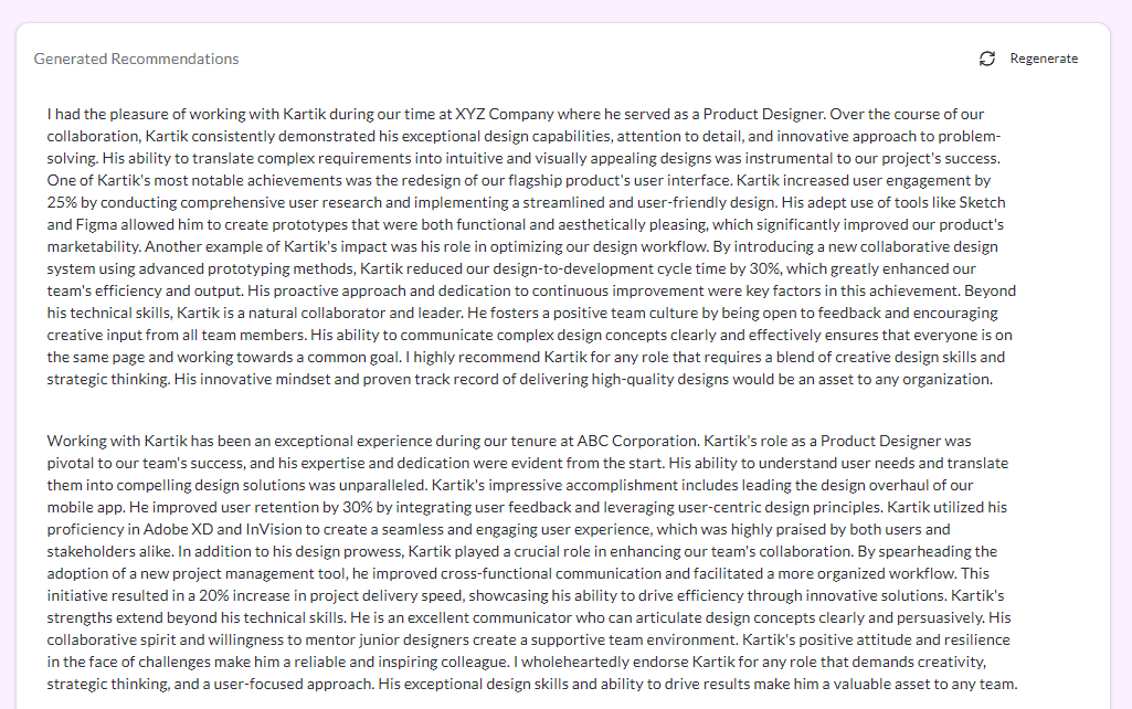 Hit Generate and get a solid recommendation draft. Read it, tweak it with specific details or stories you remember, and make it yours. The best recommendations have a personal touch that only you can add.