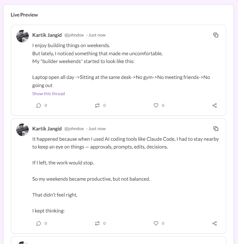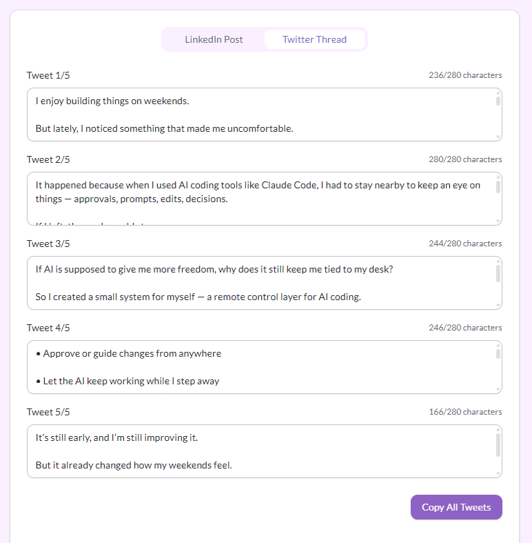 Get your LinkedIn-ready version with proper formatting, adjusted tone, and expanded context where needed. Copy and post directly to LinkedIn!