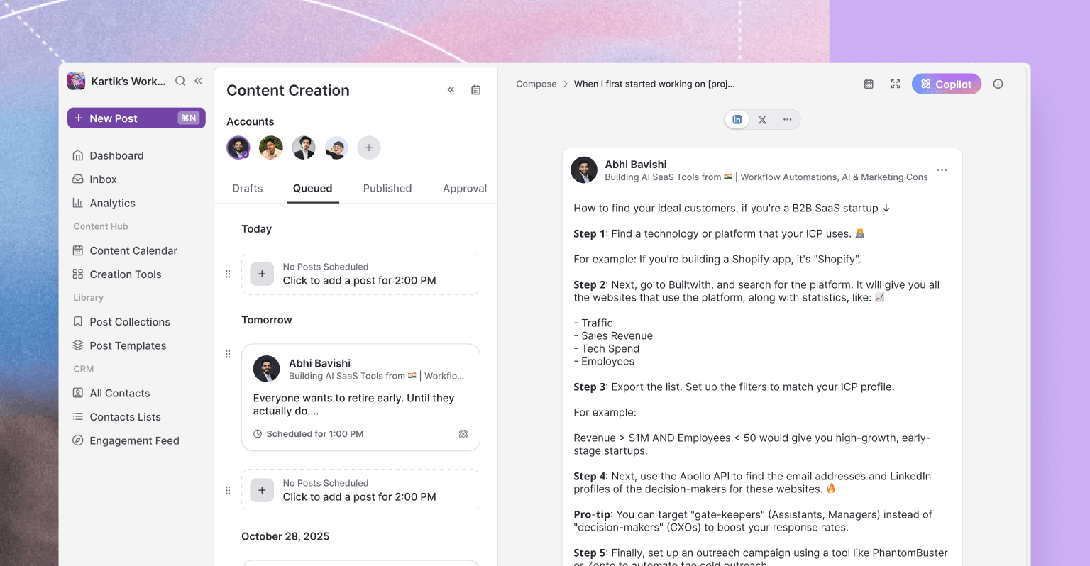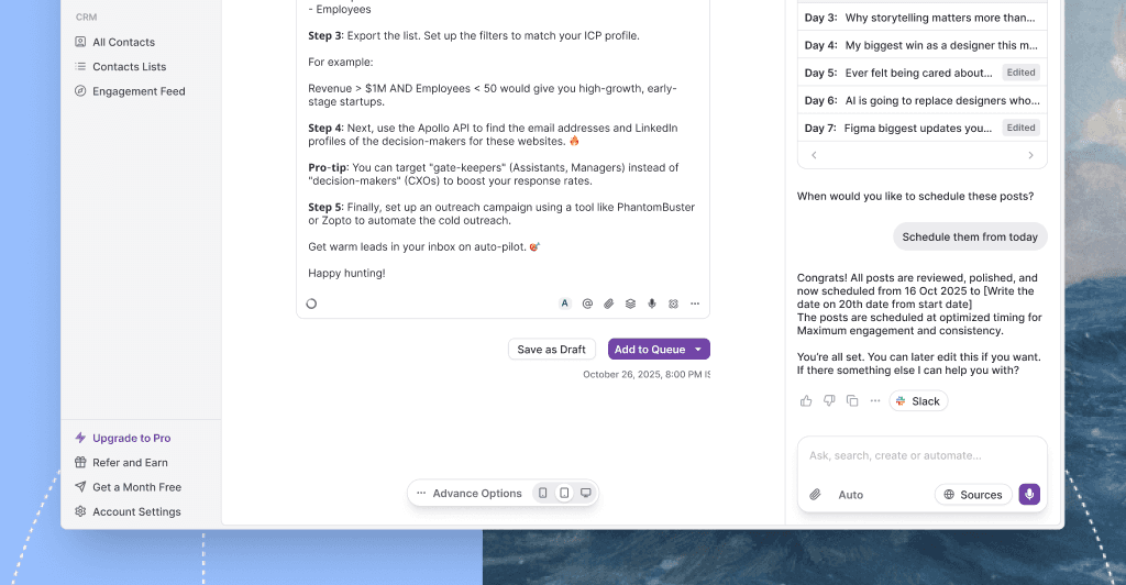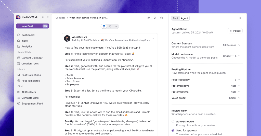 Create posts, design carousels, schedule your week, and save the best posts to your swipe file. Stay consistent without burning out.