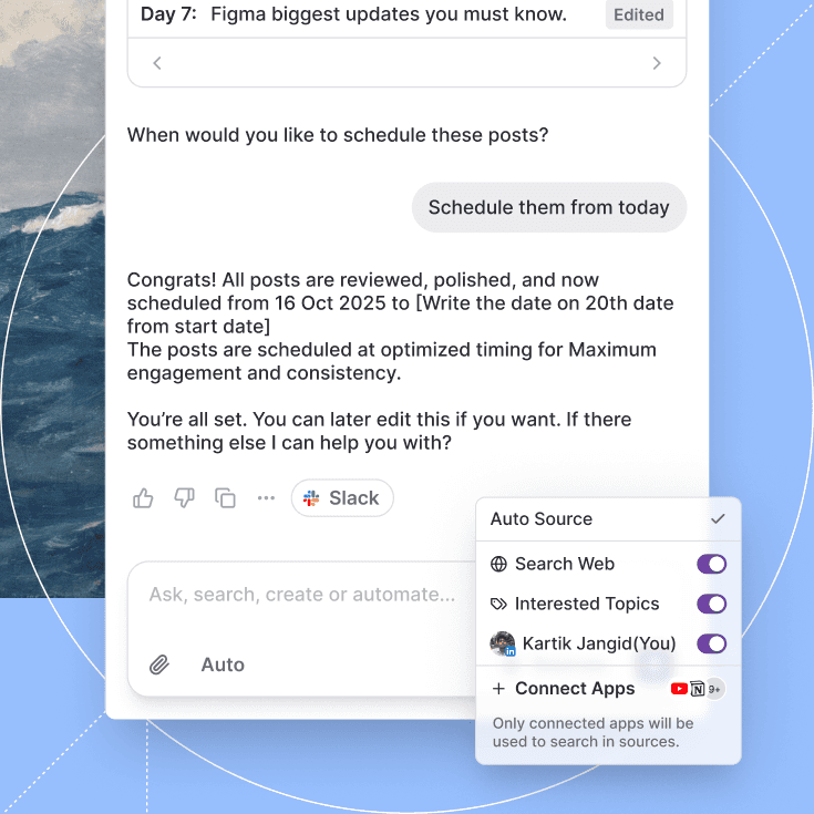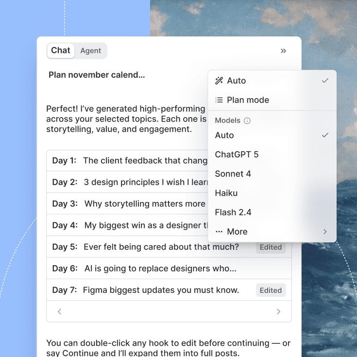 Draft content about your career transition, your latest project, or your take on industry trends - right inside Claude or ChatGPT. Generate a week of posts in one conversation and schedule them on LinkedIn® or X.