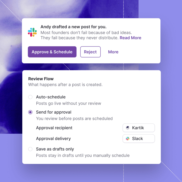 Pick where approval requests land: in-app, a Slack channel, or email. You will never miss a draft waiting for your sign-off.