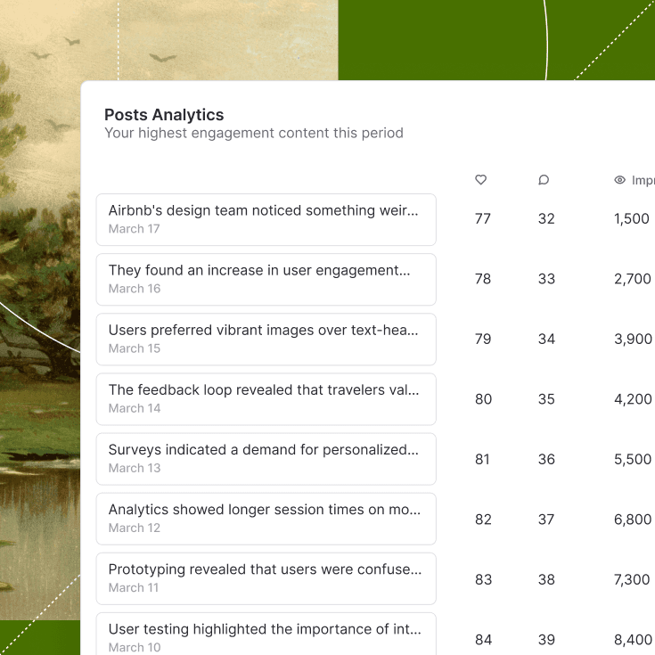 Every published post with its likes, comments, reposts, and impressions in one sortable table. Find what actually worked - not what felt like it did.
