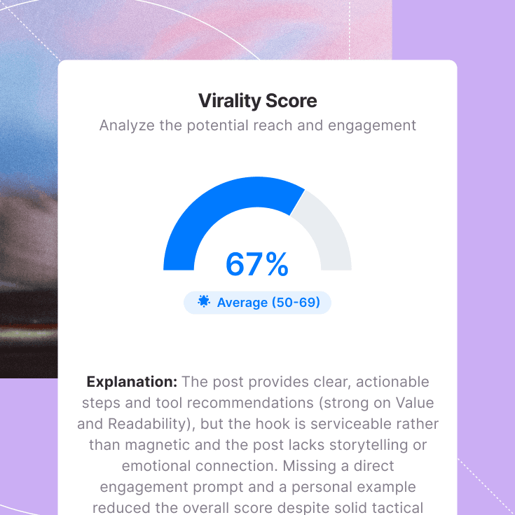 Grade your post before your audience does. The Virality Scanner tells you what's working and what to fix - before it's too late to change it.