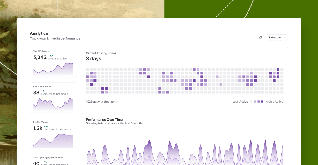 Set a posting target, track your streak, and see exactly which posts drove results. When you can see the pattern, you can repeat it.