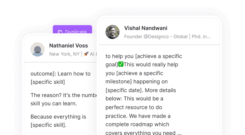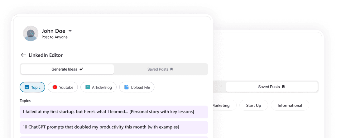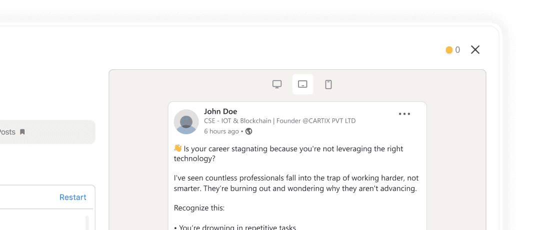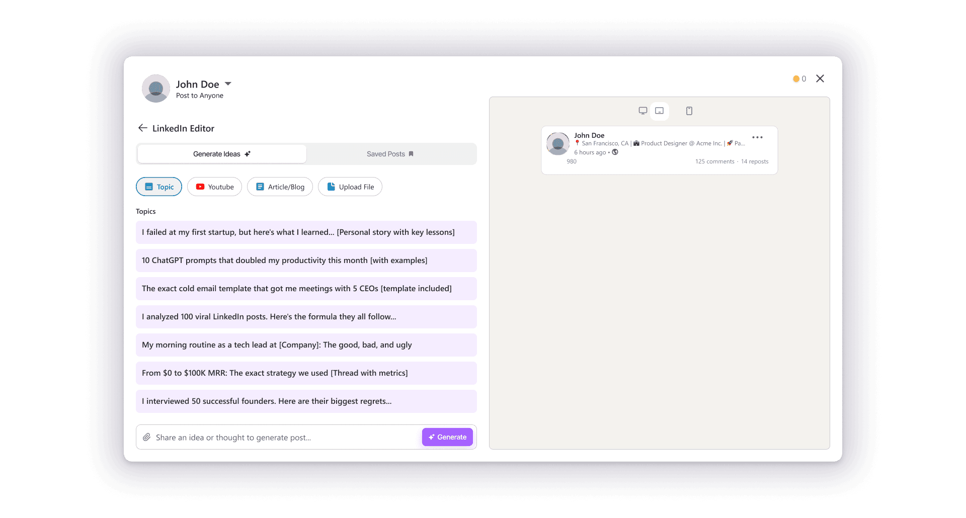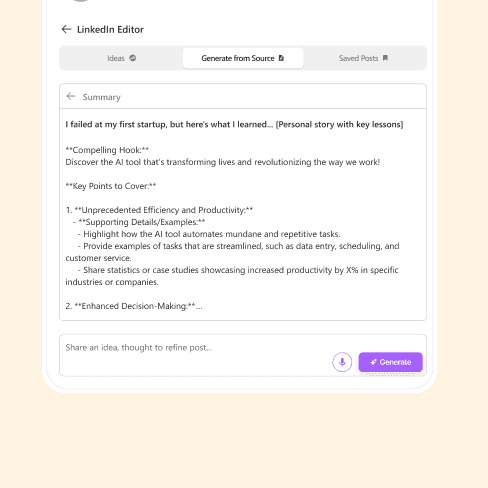 Transform your outline into high-quality LinkedIn posts within seconds. Our fine-tuned AI helps craft engaging, professional content that resonates with your audience.