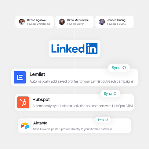 One-click to save profiles to your lists. Automatically syncs profile data, contact information, and LinkedIn activity to your CRM and sales tools.
