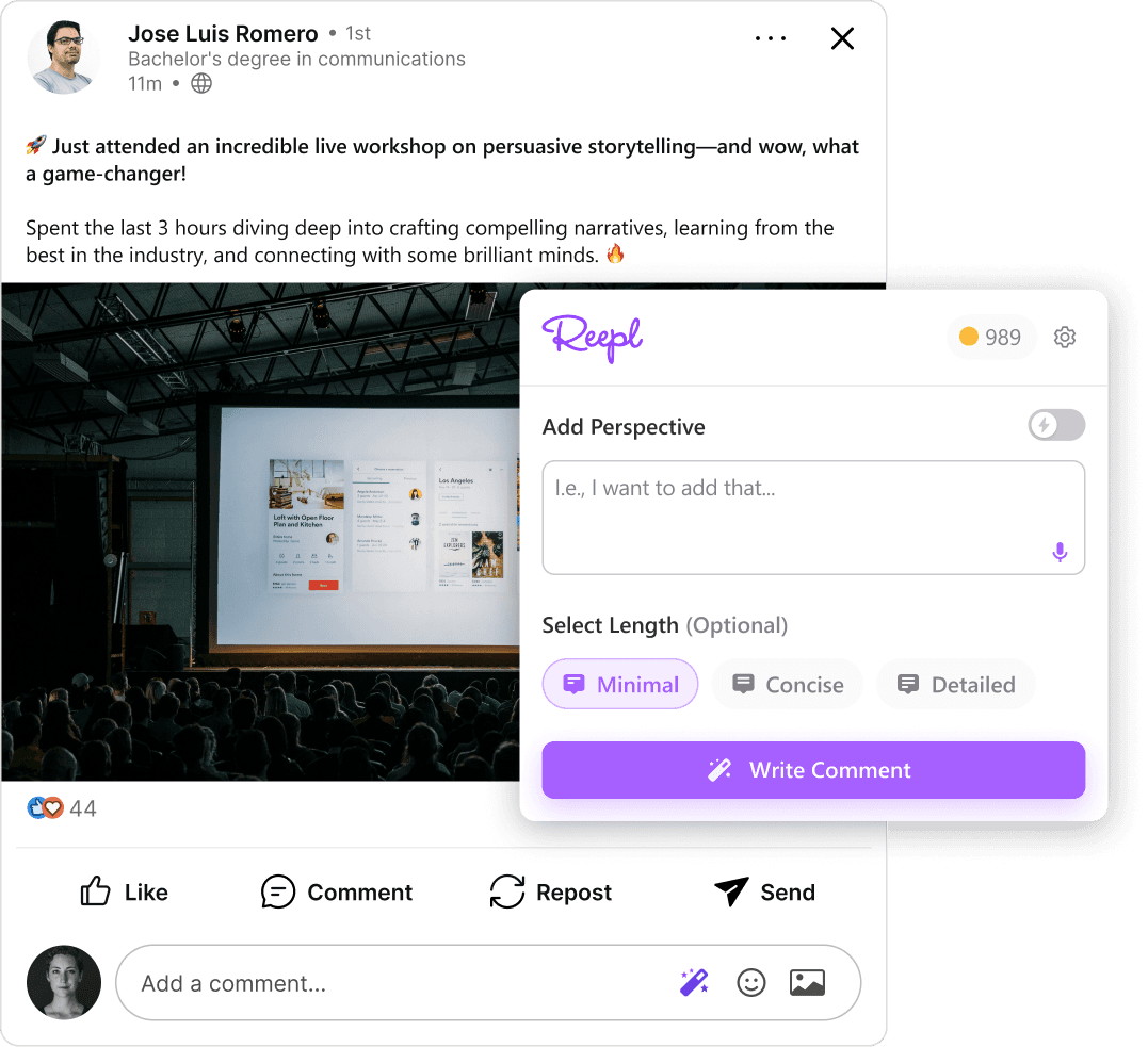With our extension, you can scan any LinkedIn post in real-time. Reepl understands the content, context, and can even scan images, while you browse feed.